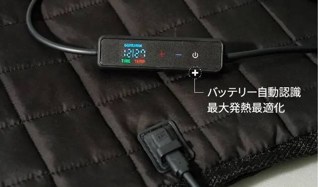 使いやすさの秘密が、このコントローラー。接続したモバイルバッテリーやアダプターの出力を自動で解析し、そのバッテリーが無理なく供給できる電力量の範囲で動作をコントロール。ホットマット自体は最大28Wまでの設定に対応しますが、利用するバッテリーの性能によっては、AIコントローラー側が設定温度を制限することも可能です。