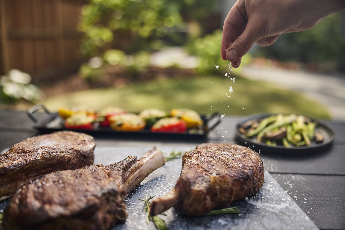 片手でノブを回すだけで、スムーズに着火。高温から低温まで細かく調整できるため、食材や料理に合わせて最適な火加減で調理が可能です。さらに、圧倒的な火力を誇るシアゾーン機能も搭載。瞬時に強火に切り替えられるので、肉や魚に香ばしい焼き目をつけるのもお手のもの。自宅の庭やベランダで、プロのような仕上がりを実現できます。