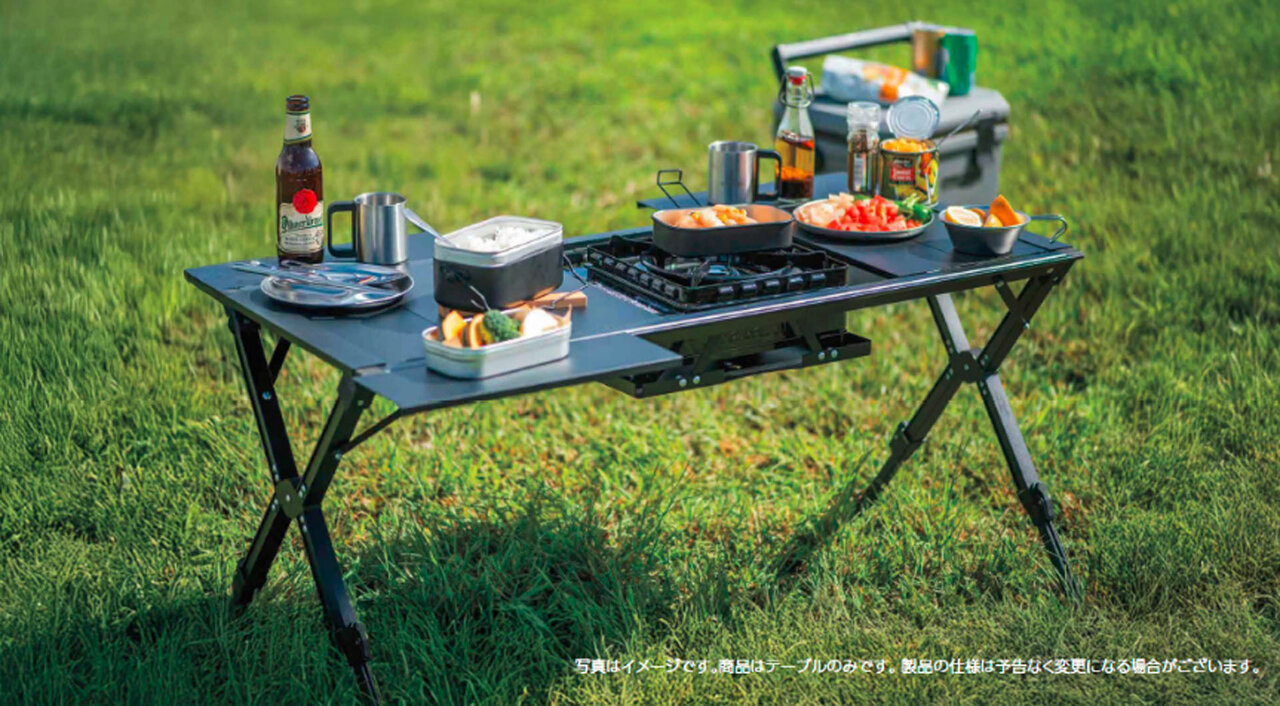 「アウトドアシステムテーブル」は、アウトドアの自由度を広げてくれる1台です。七輪やカセットコンロを好みの位置に設置できる構造で、調理スタイルに合わせたレイアウトが可能。天板パネルをサイドに取り付ければ、テーブルの拡張もできます。