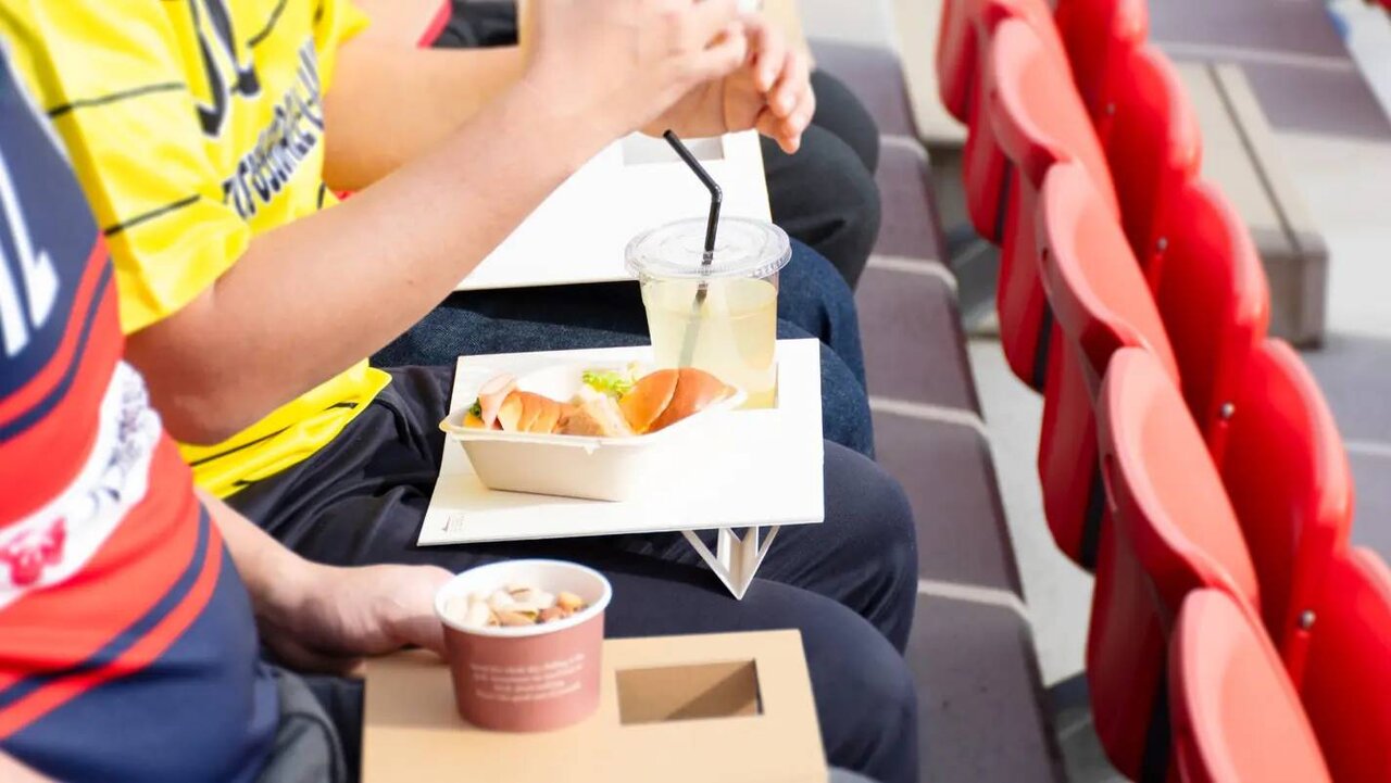 スタジアムで試合を観戦しながら、快適に食事やビールも楽しみたい。そんな時にカバンからさっと取り出して使いたいのが「Kneeble(ニーブル)」です。膝上に置くだけで、テーブルとドリンクホルダーが即完成。スポーツ観戦時のフードやドリンクの置き場にもう困らずに済みそう!
