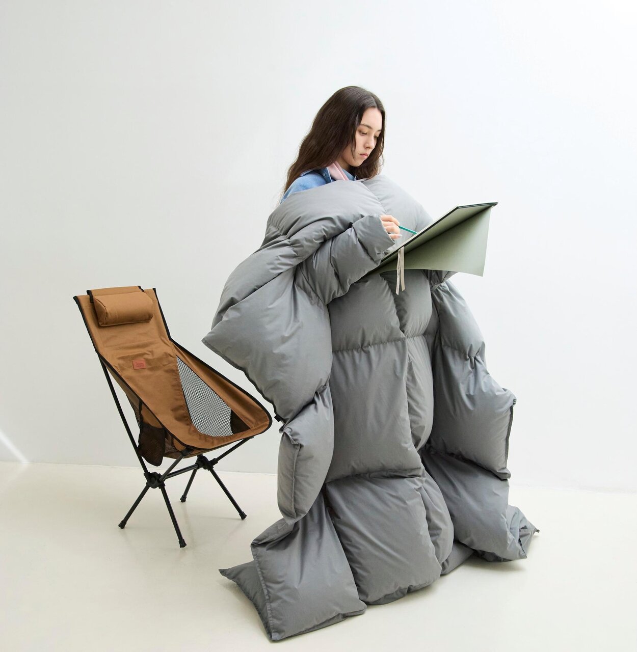 この袖付き構造は、室内だけでなく屋外や車内といった過酷な環境下でもその真価を発揮。キャンプ場での冷え込む朝晩や、車中泊においても、羽毛布団の軽さと暖かさを纏ったまま作業ができます。