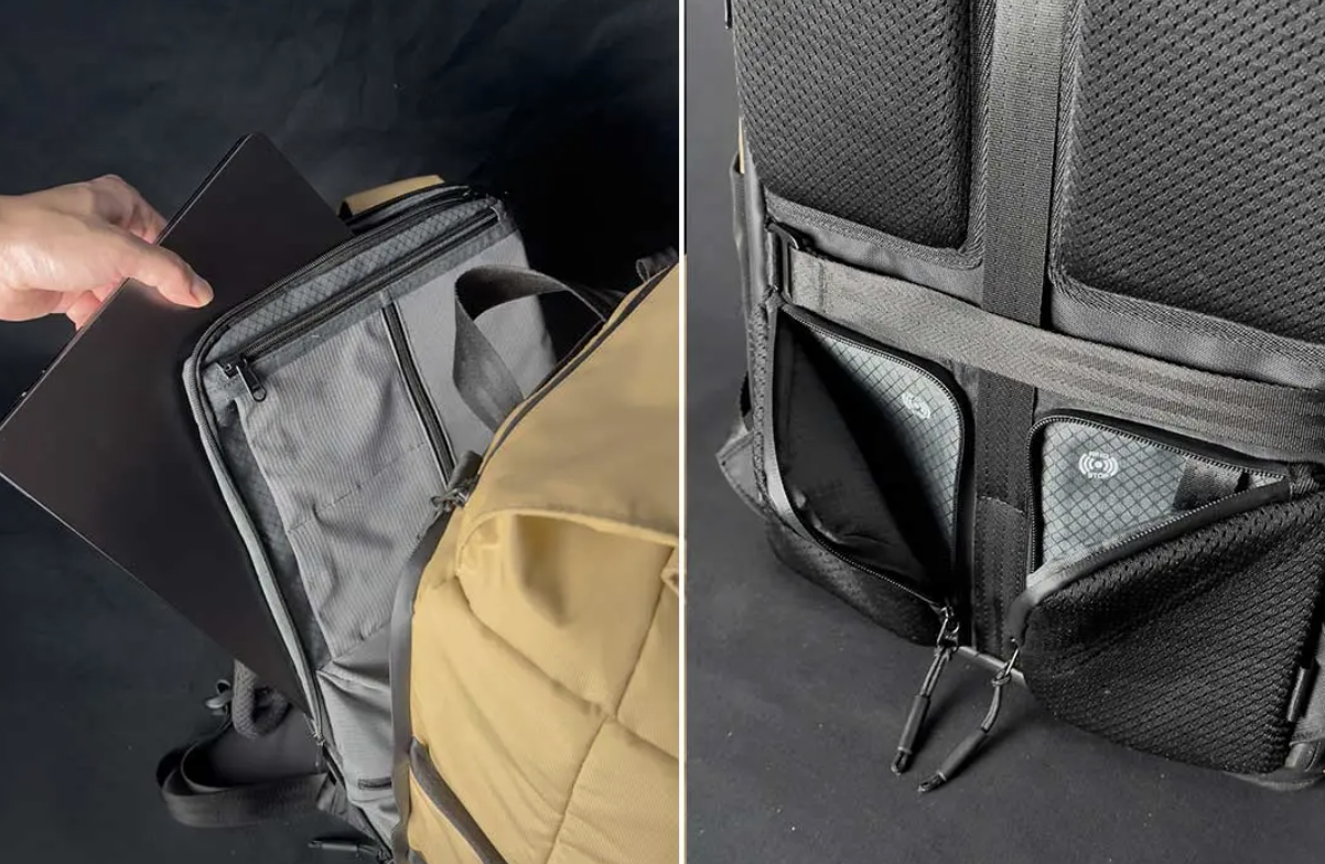 外側に9ヶ所、中には6ヶ所、背面には2ヶ所のポケットを完備。特に背面ポケットには、スキミング防止(RFIDブロック加工)仕様になっていて、防犯対策も万全です。クッション性に優れたパソコン収納ポケット(16インチまで対応)も備わっており、出張などのシーンでも活躍してくれますよ。