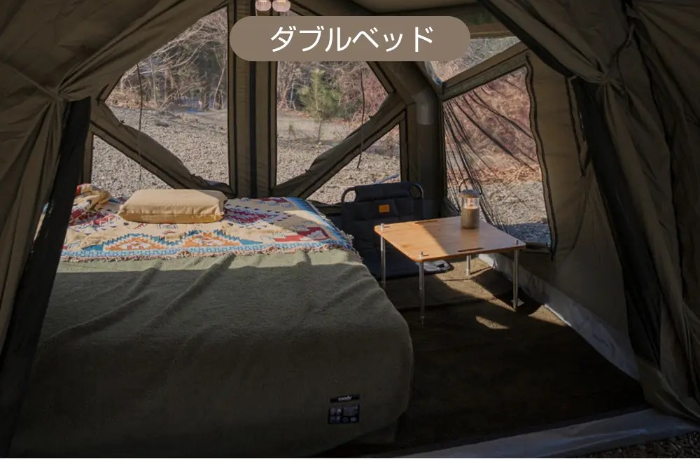 そろそろ我が子とキャンプデビューしたいなぁ〜。そう思ってリサーチしているときビビッときたグランピングエアテント「ヨストナ」は、単体使いも別売りギアと連結して拡張使いも可能。ダブルサイズのベッドや大きめサイズのチェアを置いてもゆったりとした室内空間を確保でき、レイアウトが自由自在です。
