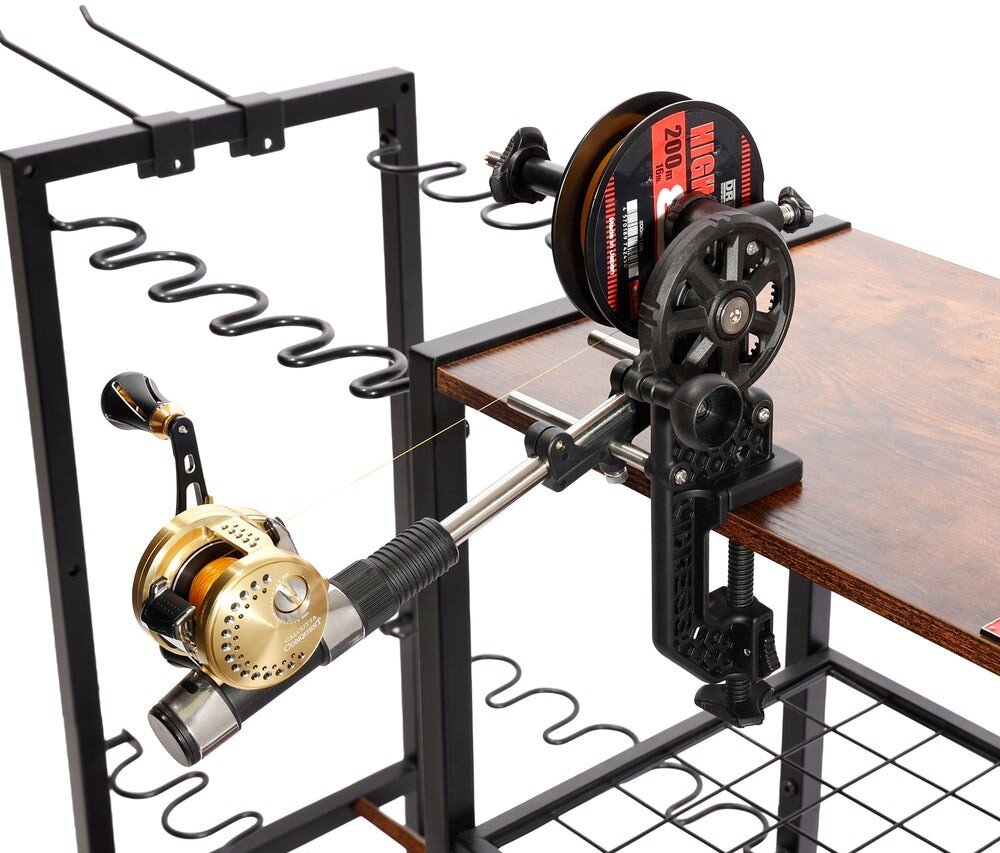 ラック上部には作業用天板が備わっており、リールのメンテナンス、ラインの巻き替え、釣行前のタックル準備などを行えます。DRESSのライン巻き替え機「マキシマムワインダーEVO」の設置にも対応しており、自宅で効率的にライン交換作業を行うことも可能です。