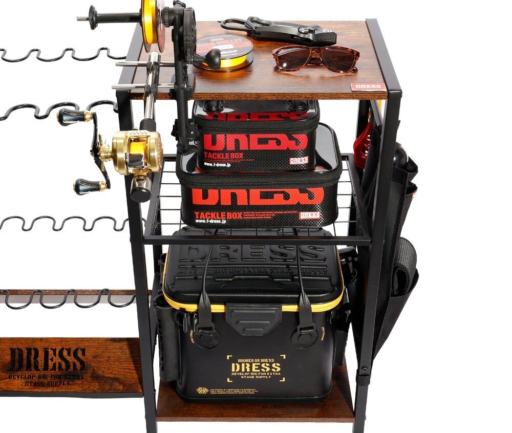 棚にはバッカンやタックルボックスを収納でき、サイドのポケットには小物をまとめておけます。「DRESS フィッシングキャスターラック」で、釣行前の準備を効率化させてみては?