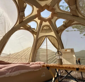 6面に配置された窓が、明るさと開放的な空間を生み出し、ドアと窓をすべて開放すれば360°に広がるパノラマビューが出現。透明な天井からは青空や星空、月明かりまでを見上げることができるだなんて、まさに贅沢な大人時間です。ワインやウイスキー片手に、テント内で過ごしてみたくなりませんか。