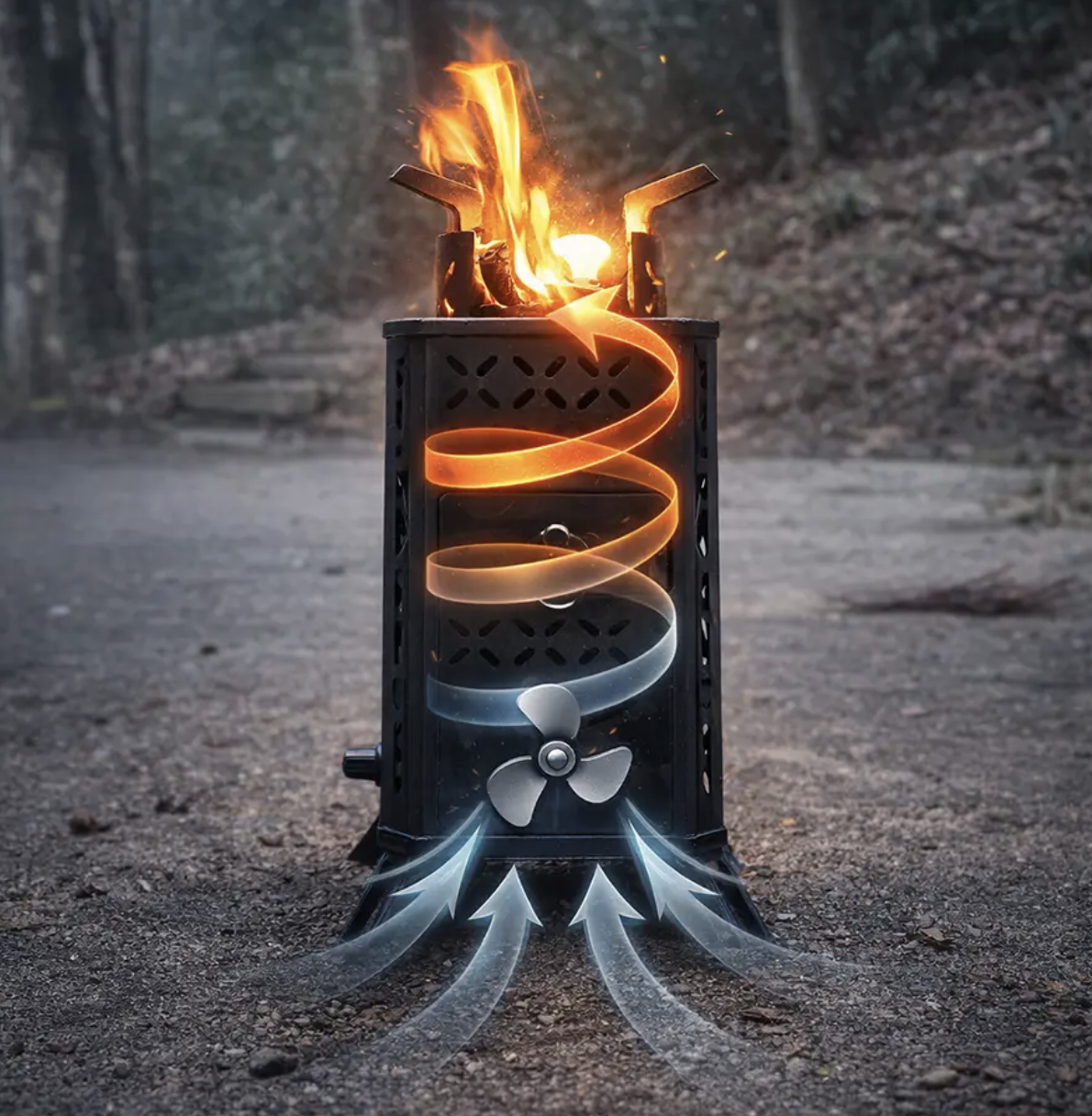 枯れ葉や松ぼっくりから着火!送風ファン搭載ストーブなら火力調整も自由自在