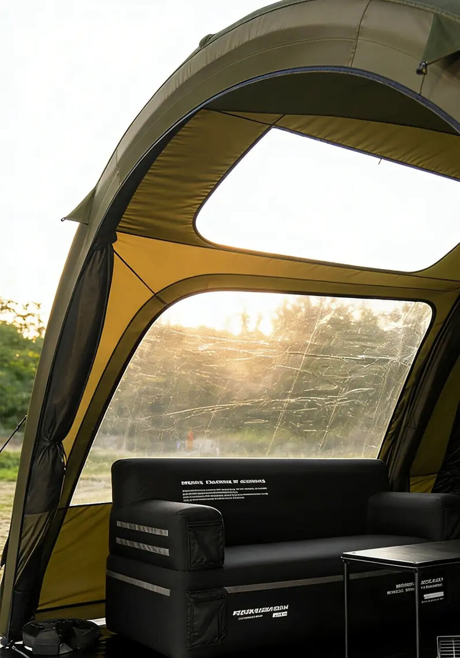 前後のドアと四側の大開口により、360度の通気性を確保。二重構造ドア(ポリエステル+メッシュ)により、簡単にメッシュモードへ切り替えが可能です。さらに、リビング3面にはTPUパネルを装着できます。天井にはTPUウィンドウも備え、天候に応じて開放感と快適性を両立できます。スカート付きで冷気や風、虫の侵入も抑制し、季節を問わず使用できる仕様です。