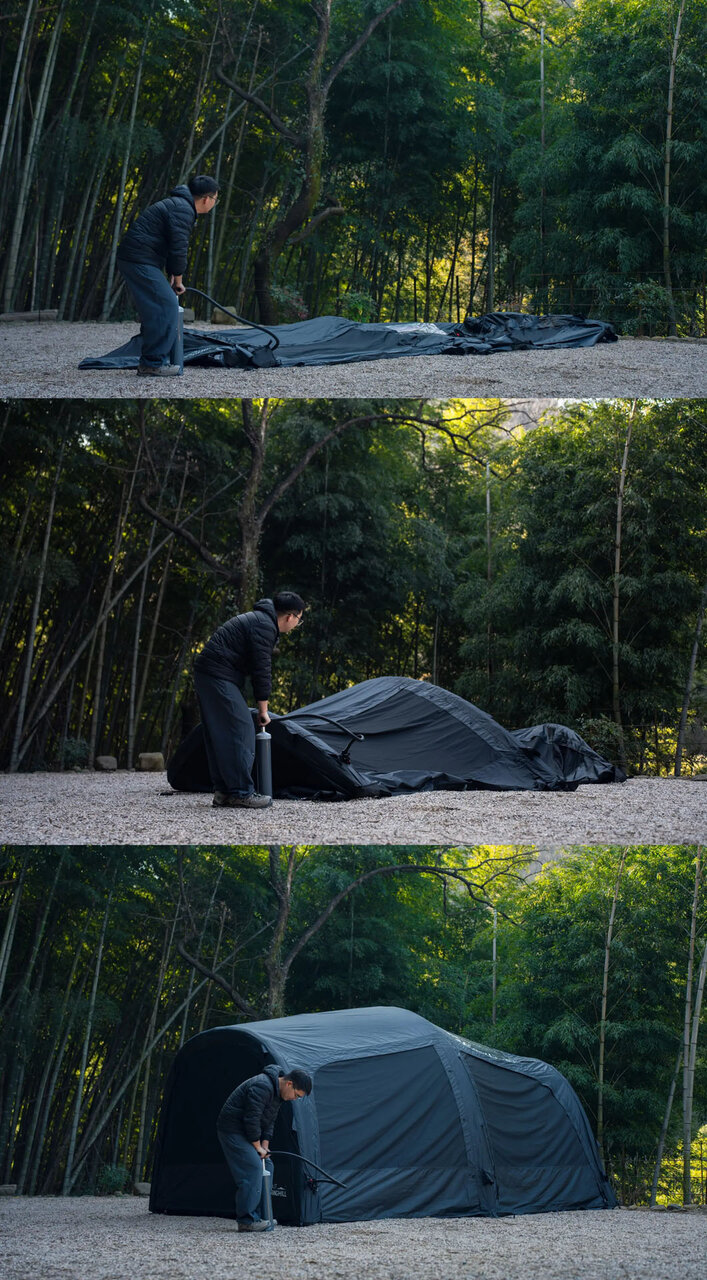 「Springhill トンネルエアーテント」の設営方法は非常にシンプル。テントを広げ、ポンプを接続して空気を注入するだけで、約150秒でしっかりと自立します。フレームを組み立てる必要がなく、複雑な手順も不要。キャンプ場に到着してすぐにくつろぎの時間をスタートできる設計といえるでしょう。