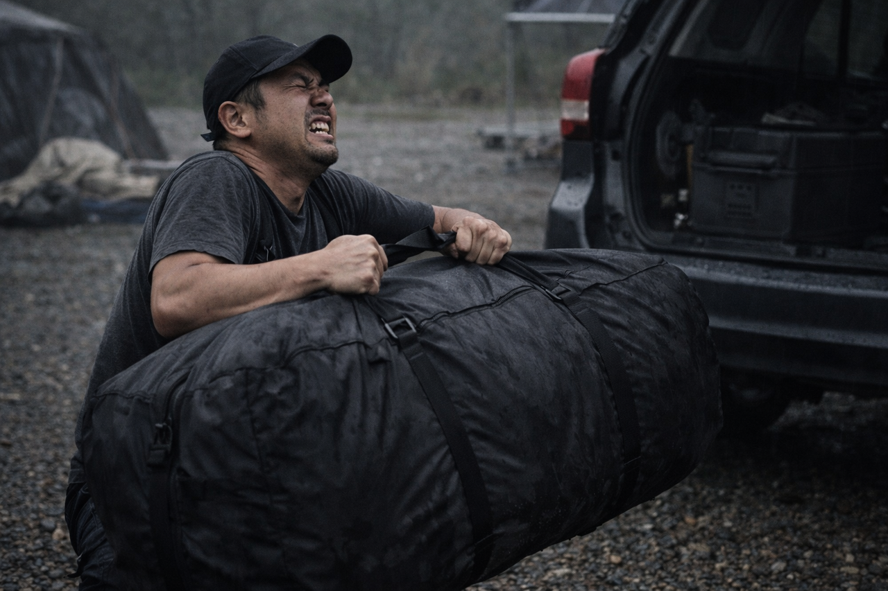 大型エアテントでは、40〜50kg級の重量が珍しくありません。設営は空気を入れるだけで簡単なのに、積み込みと撤収で汗だくになります。設営自体はラクでも、積み込みや運搬、撤収時の負担がネックになりがちです。