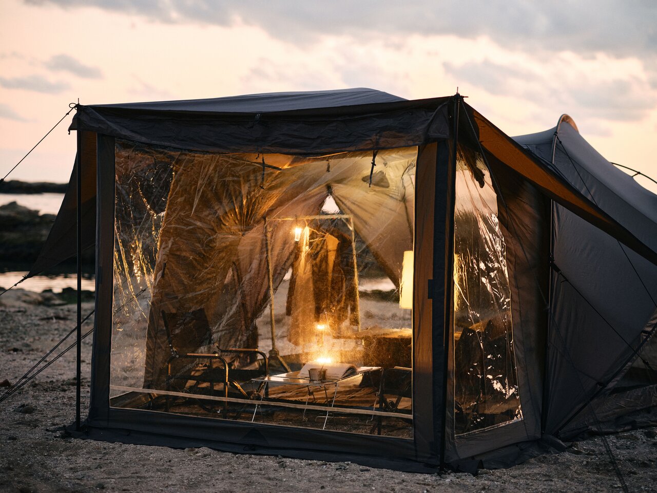 正面と両サイドに配した三面のTPUウィンドウが、雨風を防ぎながら外の景色や光を届けます。また、別売りのインナーテントと組み合わせれば、リビングと寝室を分けた2ルームスタイルのレイアウトにも対応。天候に左右されず、ぜいたくなアウトドアライフを満喫できますよ。