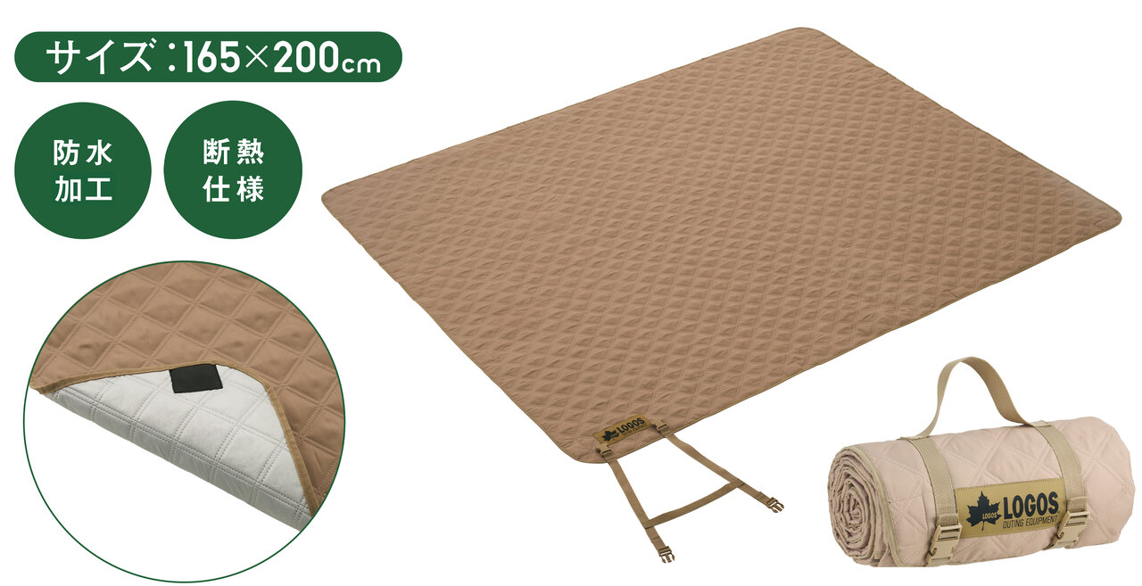 さらに、アルミ蒸着加工(地面からの冷気を伝わりにくくする処理)による断熱性能も備えています。中綿入りのキルティング生地により、長時間座る場面でも使いやすそう! レジャーシート1枚で「濡れない、冷たくない、硬くない」の三拍子が揃っていて使い勝手が良いアイテムです。