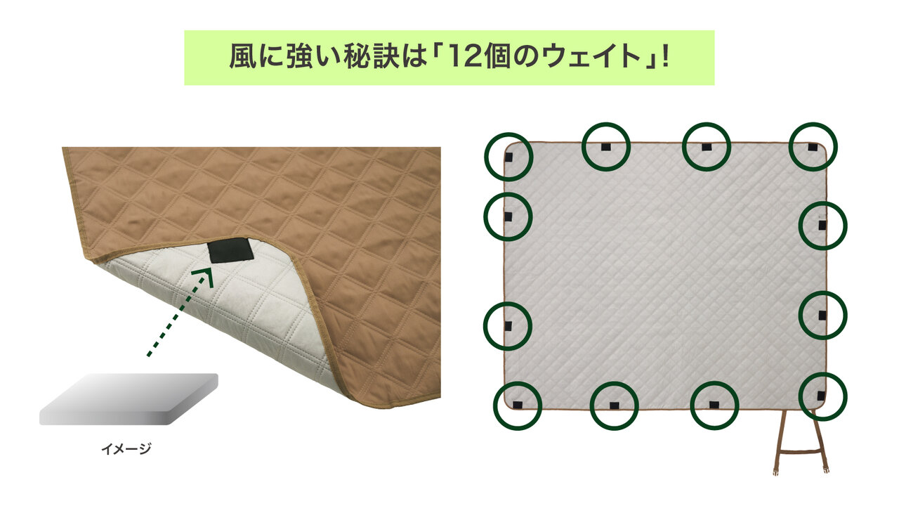 このシートの最大の特徴は、内部にステンレス製のウェイトが12個入っていること。風が吹いてもシートがめくれ上がりにくく、広げたらすぐにくつろげます。