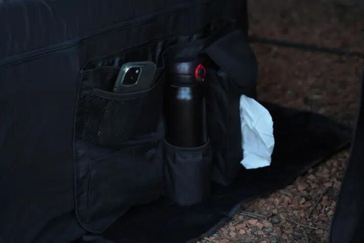 付属のベッドカバーは、ブラックを基調としたミリタリーデザインに機能性をプラス。サイドにはスマートフォンや小物を収納できるポケットを備え、ロープにはカラビナを取り付け可能といった実用性の高さが魅力です。