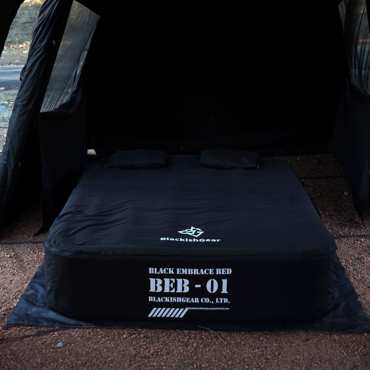 これアウトドア用なの……? と驚いてしまうほど美しい見た目の「BLACK EMBRACE BED」。野外で本格ダブルベッドに寝転べる、ミリタリーなエアベッドです。