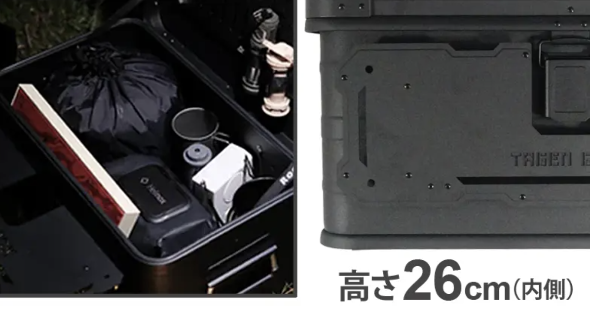 今季の“買い足しギア”一番手に入っているのが、ブラックをまとった多機能コンテナ。50Lの大容量でなんでも収納。収納はもちろんテーブル・調理台と多機能に使える優秀な逸品です。