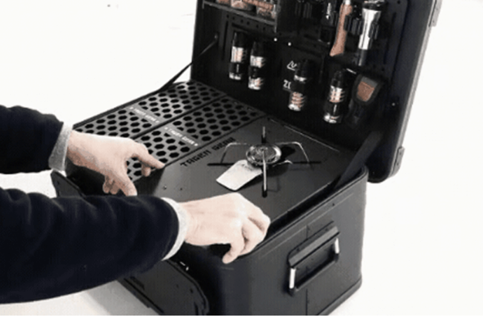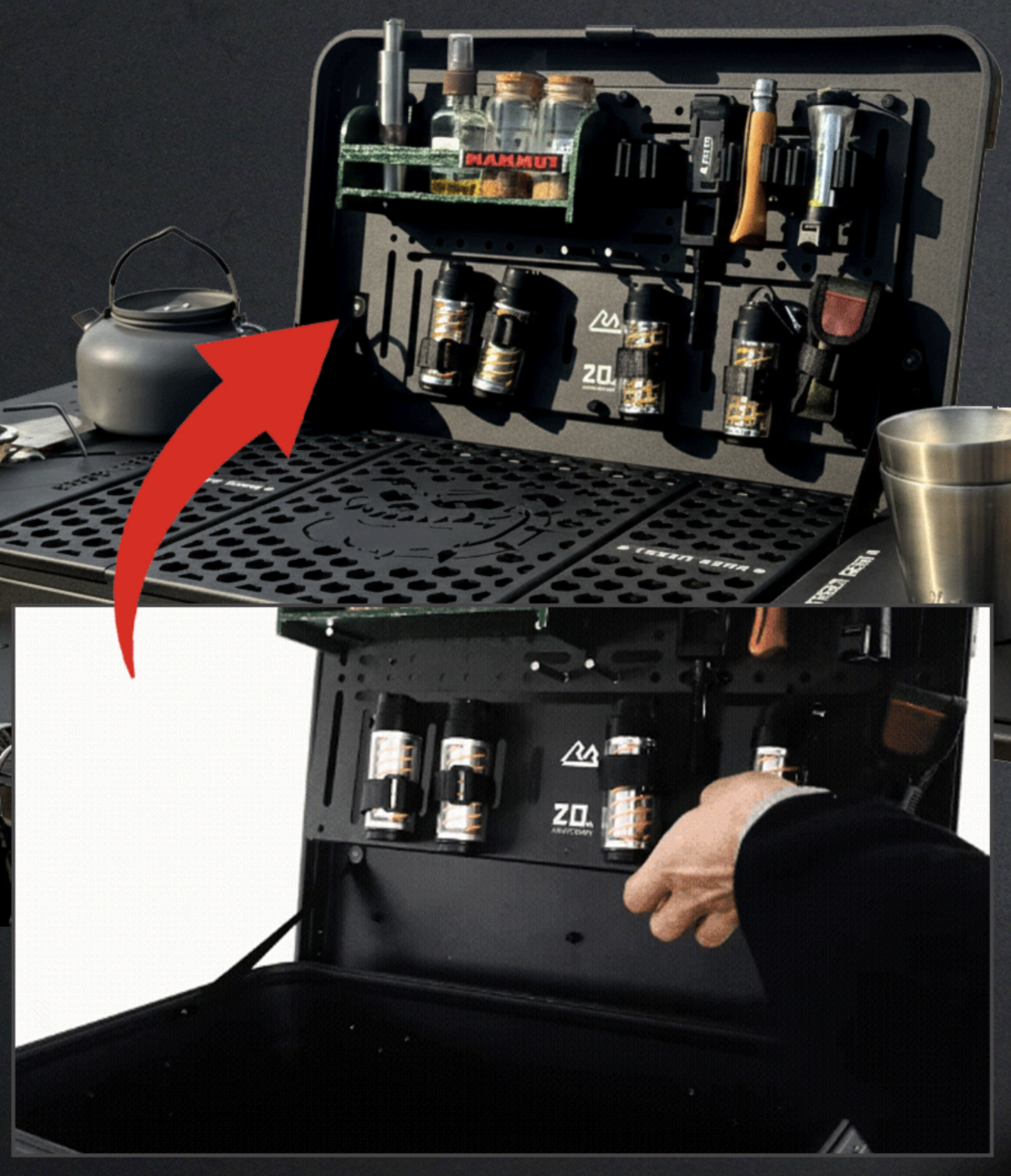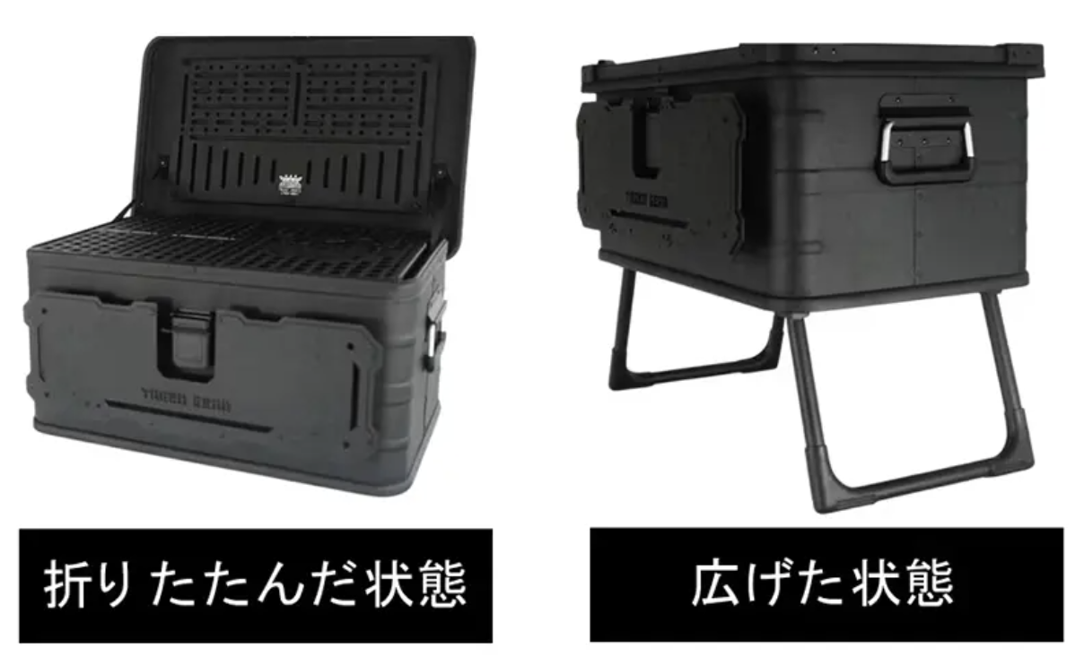 メインプレートに施されたデザインが、無骨な佇まいを演出。中身が見えるパンチング天板なら、閉めたまま中身を瞬時に把握できます。設営から調理まで、ギアを探す手間なくスムーズに取り出すことが可能です。