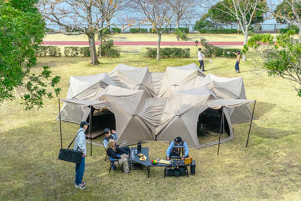 もうひとつ注目したいのが「ヘキサ型キャンプシェード用トンネルL」。リビングと就寝スペースを分けるようなレイアウトにも対応しやすく、グループやファミリーでの使い勝手を高めてくれます。収納時はW26×D41×H9cmとコンパクトで、重量も1.4kg。雨の日でも濡れずにリビングと寝室を行き来できるのは、嬉しいですね!