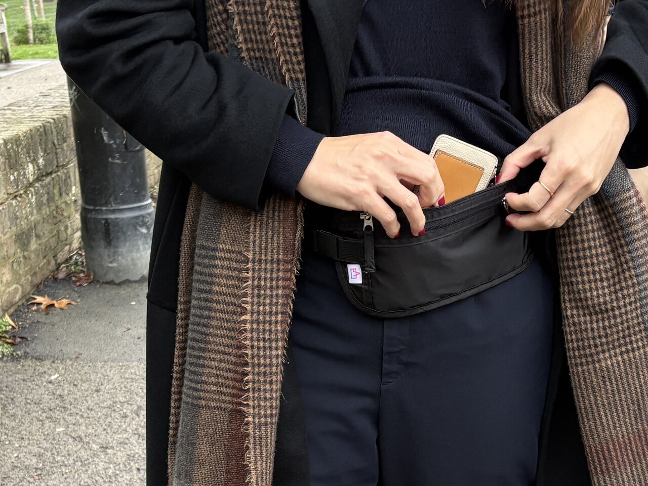 服の下に着けて歩いてみると、スリに盗られる不安が大きく減りました。バッグだと人混みで無意識にファスナーの位置を気にしていましたが、セキュリティポーチは服の内側に固定できるため、外側から触られる心配がほとんどありません。写真を撮るときや立ち止まった瞬間も、後ろから狙われる不安が薄れ、気持ちに余裕が生まれました。