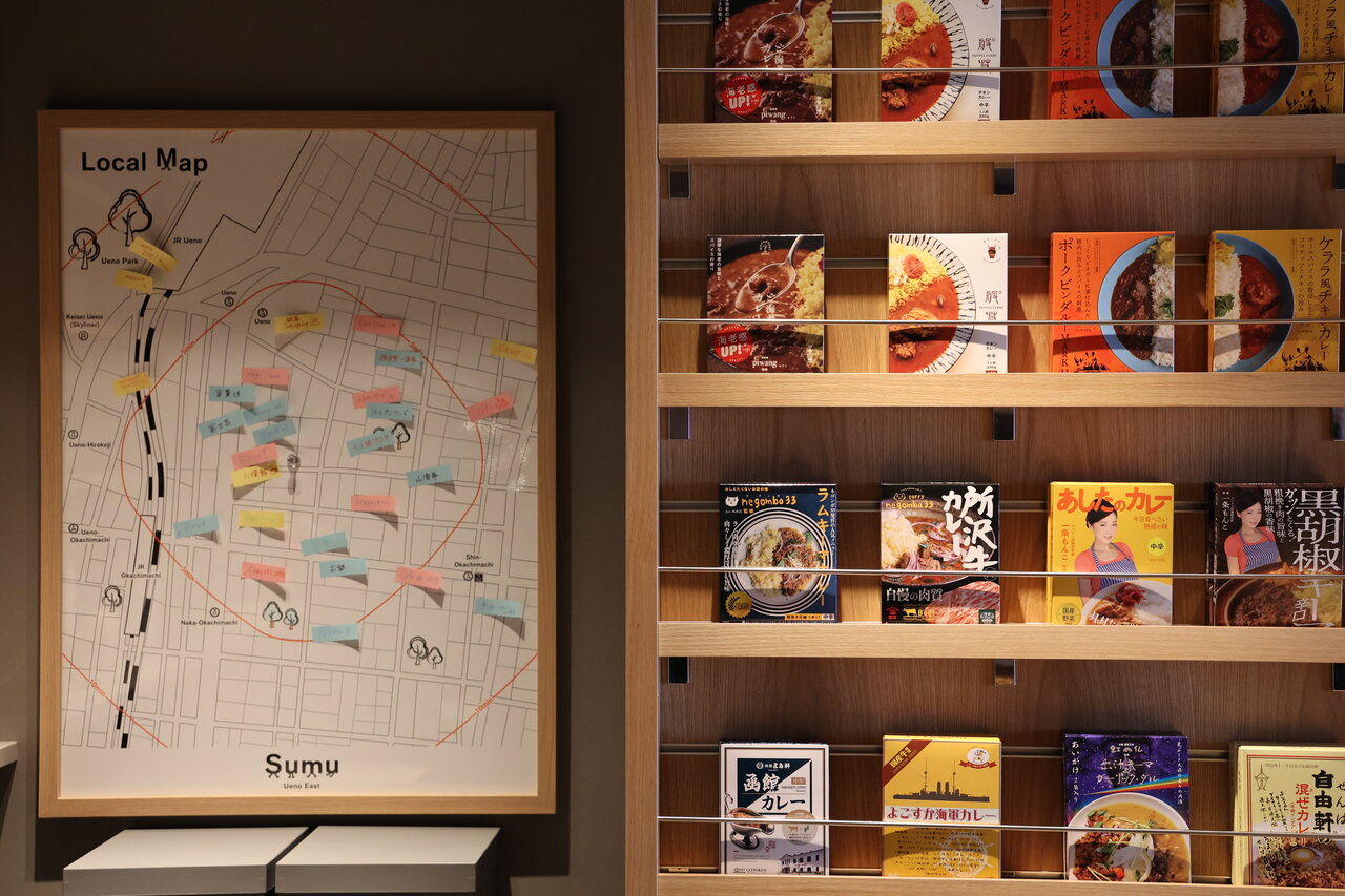 書籍のように並べられているご当地レトルトカレー(右)は、滞在者が自室に持ち込んで食べられる。その横にあるボード(左)には、宿泊者が徒歩8分圏内で実際に行った「おすすめ店」をシェアするためのもの。観光ガイドブックには載っていないリアルなロ-カル情報を一目で見られる。このリアルMapだけでなく、スマートフォンで見ながら外出できるデジタルMapも用意されている。