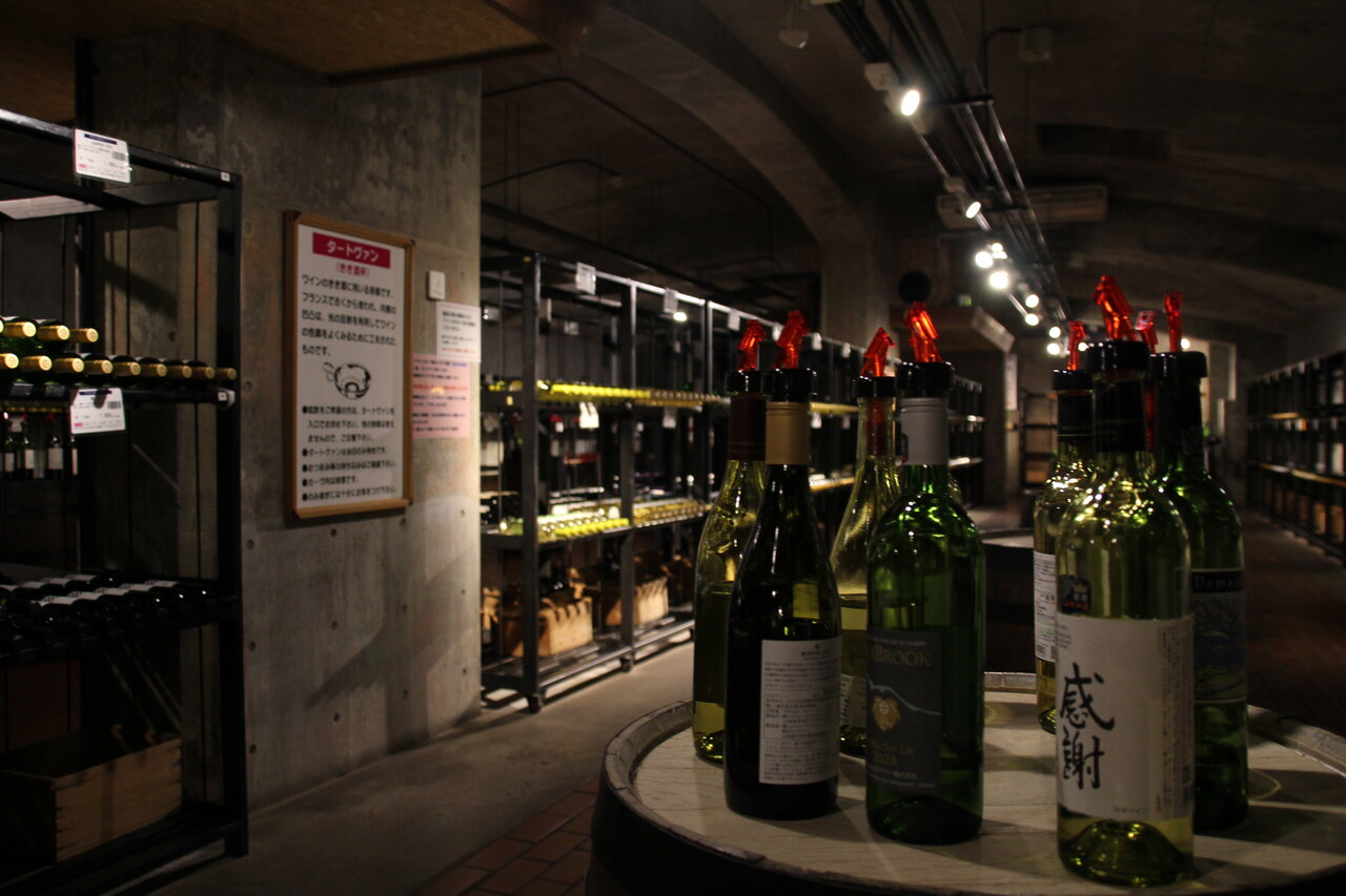地下にあるワインカーブには100銘柄以上、約2万本のワインが貯蔵されていて、すべてのワインを試飲することができます。ひんやりした空間にはワインの良い香りが漂っていて、たくさんのワインボトルが並んでいます。