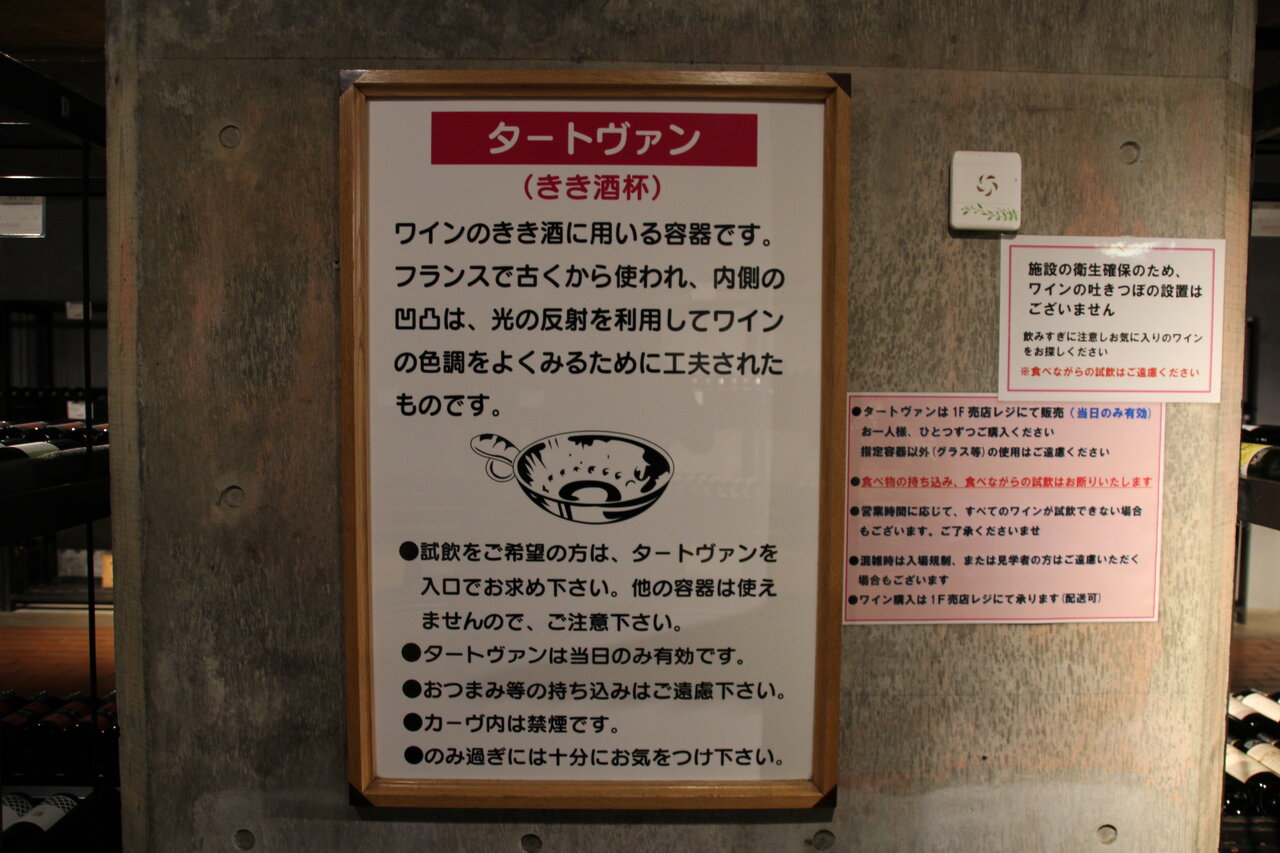 試飲は専用の試飲容器「タートヴァン」を2200円で購入して楽しむことができます。この日も1組のグループがワイワイ試飲を楽しんでいました。山梨での旅の思い出を作るには良いスポットではないでしょうか。筆者も試飲したいところですが、車中泊でワインをゆっくり楽しむ予定なので、ここではガマン。