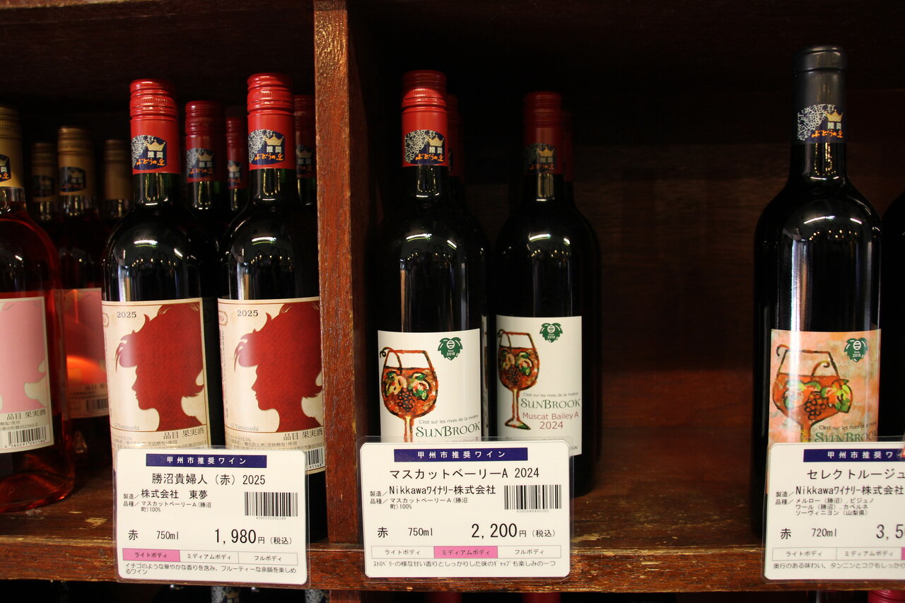 保坂さんいわく、『甲州産ワインでポピュラーな品種はマスカットベーリーAという品種で、ラインナップとしてライトやミディアムボディといった軽い飲み口のワインがメインです』とのこと。持ち帰りを考えると『開閉できるキャップタイプが便利ですよ』と教わりました。