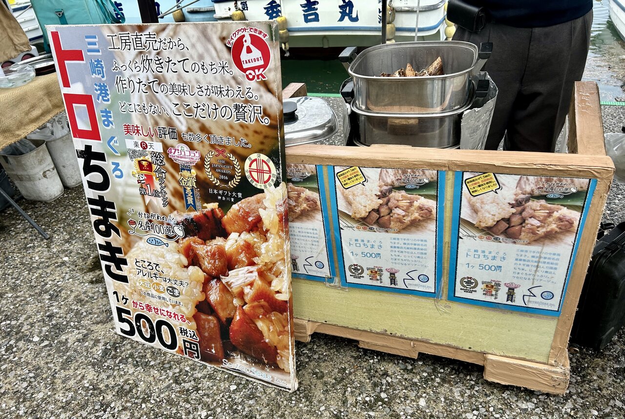 さきほど買った屋台グルメをいただきます。まずは熱々の「トロちまき」(500円)。香ばしい醤油が染みたもちもちのお米に、とろけるトロの旨み、そして筍のシャキシャキ感が絶妙なアクセントになっています。海辺の潮風を感じながら食べる朝食は、まさに贅沢。