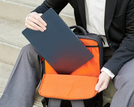 背面スペースには、16インチサイズのノートPCがをすっぽり。内側にはクッション素材を使用しているため、安心して持ち運べるところもポイント。